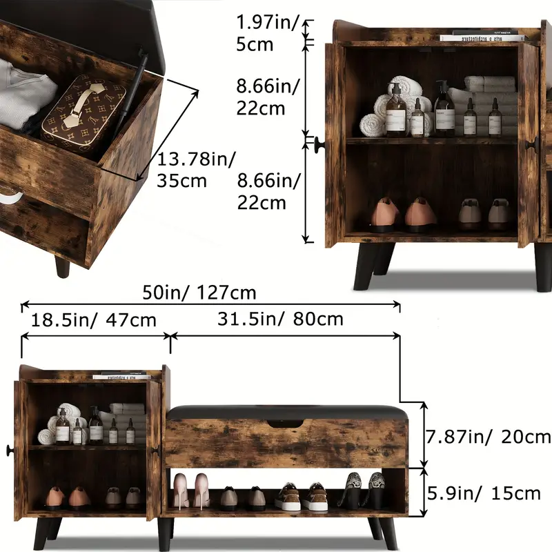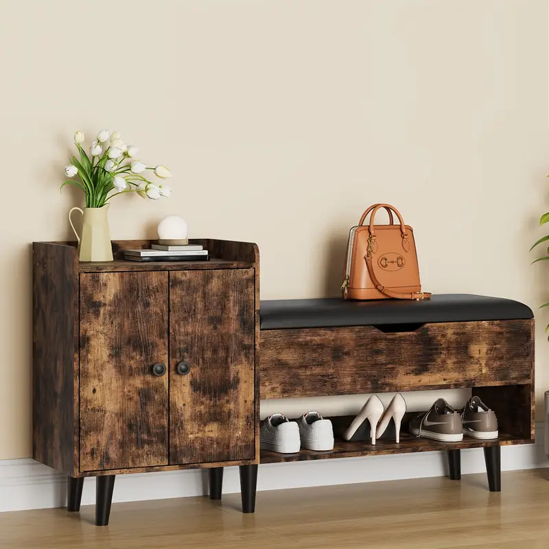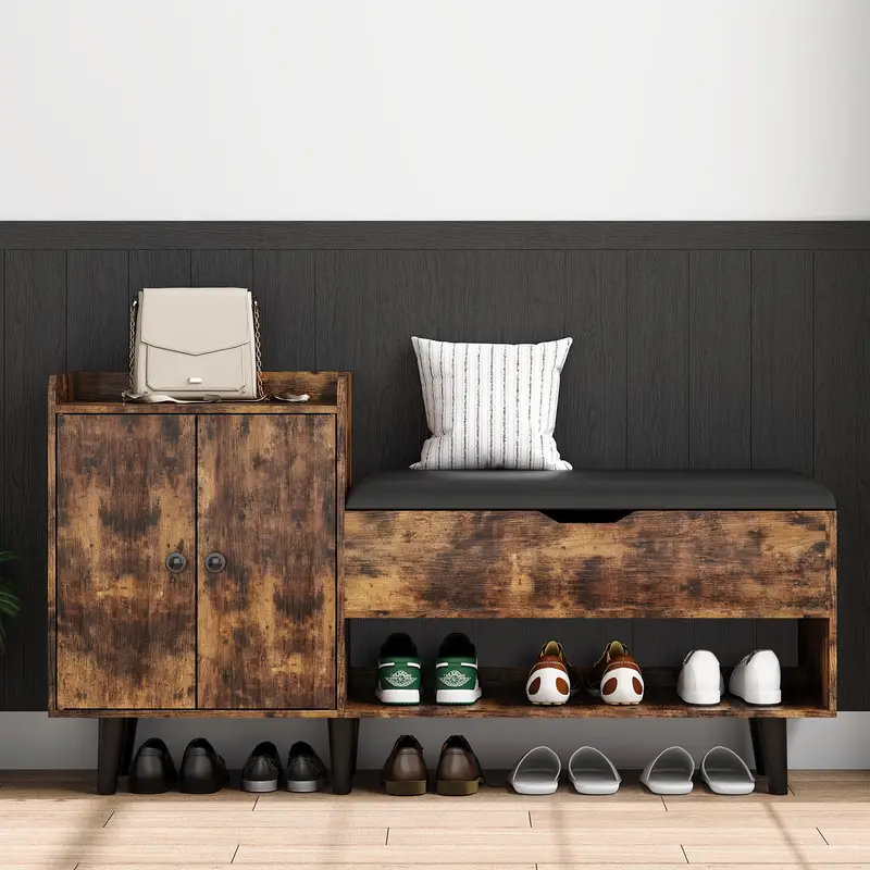 The 50″ Entryway Shoe Bench combines functionality and elegance to enhance your home. Designed for entryways, hallways, or living rooms, this versatile storage bench keeps your space organized while adding a touch of warmth. The bench features a spacious top that serves as a convenient seating area for putting on or removing shoes. Beneath, a shelf provides additional storage, while a hidden cabinet allows you to tuck away shoes, bags, or other items out of sight.