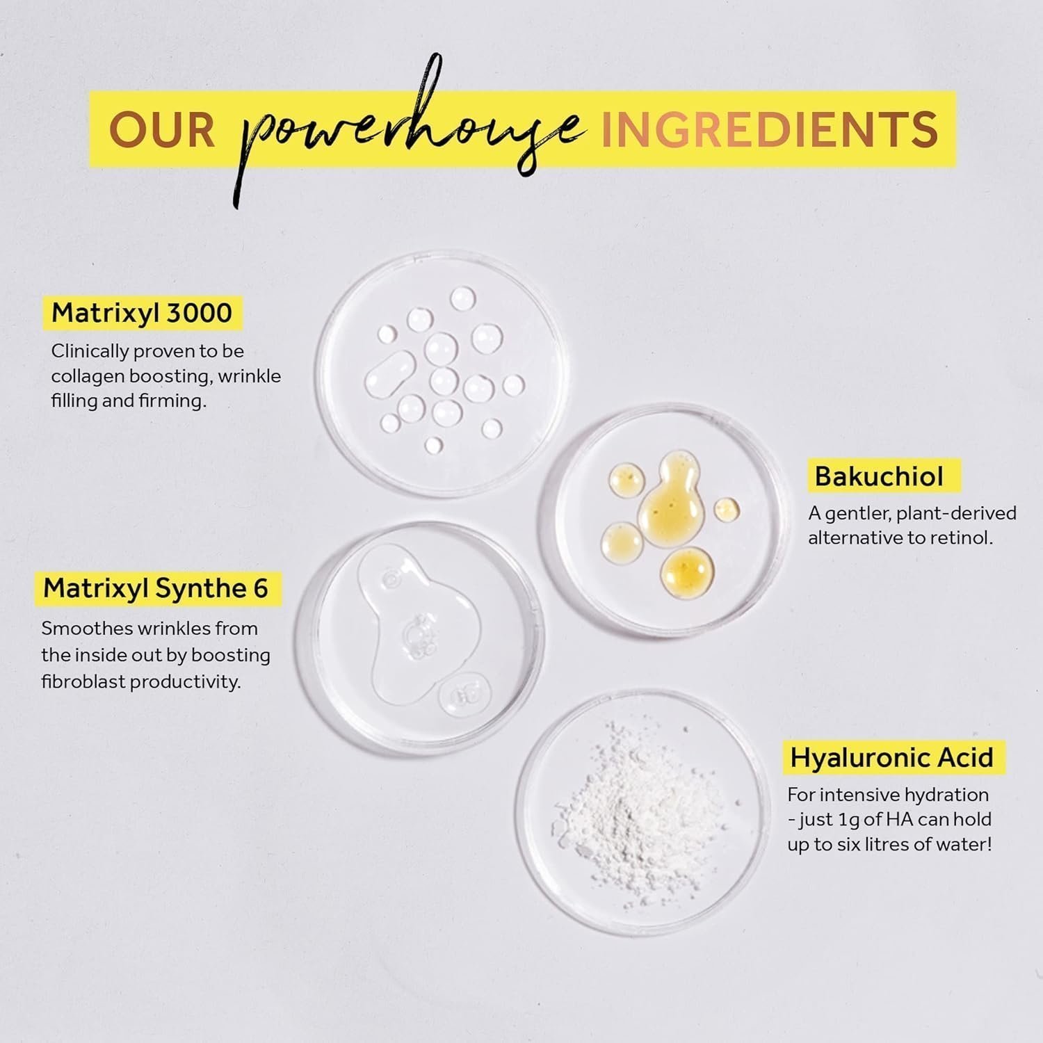 - COLLAGEN SERUM: Our 30ml bottle contains beauty must haves Matrixyl 3000, Matrixyl Synthe 6, bakuchiol and hyaluronic acid. Naturally boosting collagen levels and helping to fill in wrinkles, Matrixyl 3000 will help you on your way to a fresh faced, beautiful complexion, whilst hyaluronic acid will help to plump and smooth your skin.