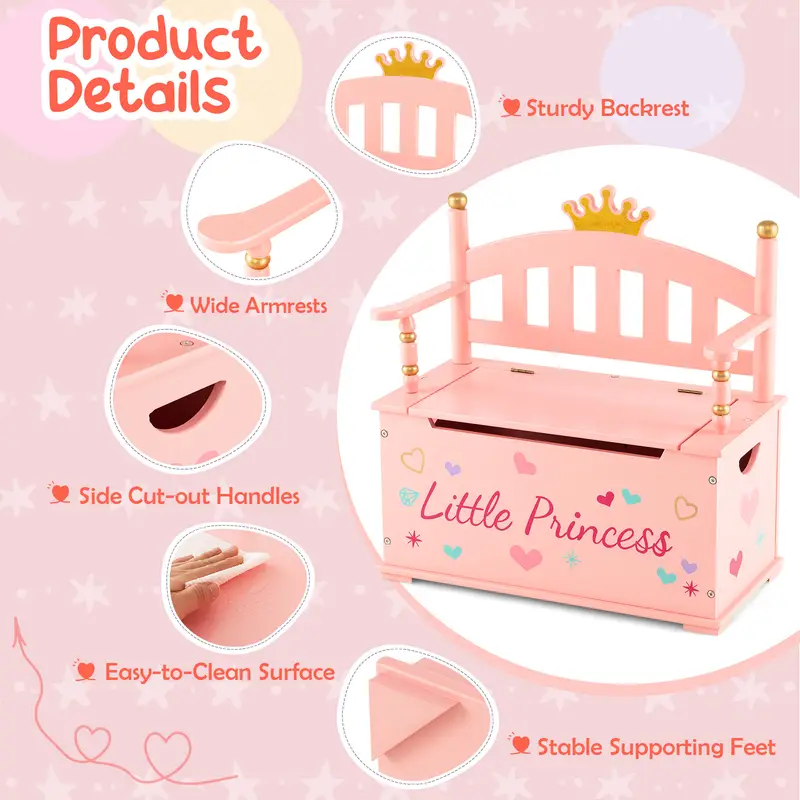 The GIANTEX Kids Toy Storage Organizer combines functionality and charm, serving as both a spacious toy chest and a bench for children ages 3-6. Crafted from durable MDF with a cork fiberboard design, it features a high backrest and safety hinge to protect little fingers. Adorned with a cute pink crown pattern, it’s perfect for a girls’ room, playroom, or nursery. With a storage capacity under 3.2 cubic feet, it neatly stores toys, books, and more, keeping spaces tidy and organized. Lightweight and easy to assemble, this 2-in-1 organizer is both safe and stylish.