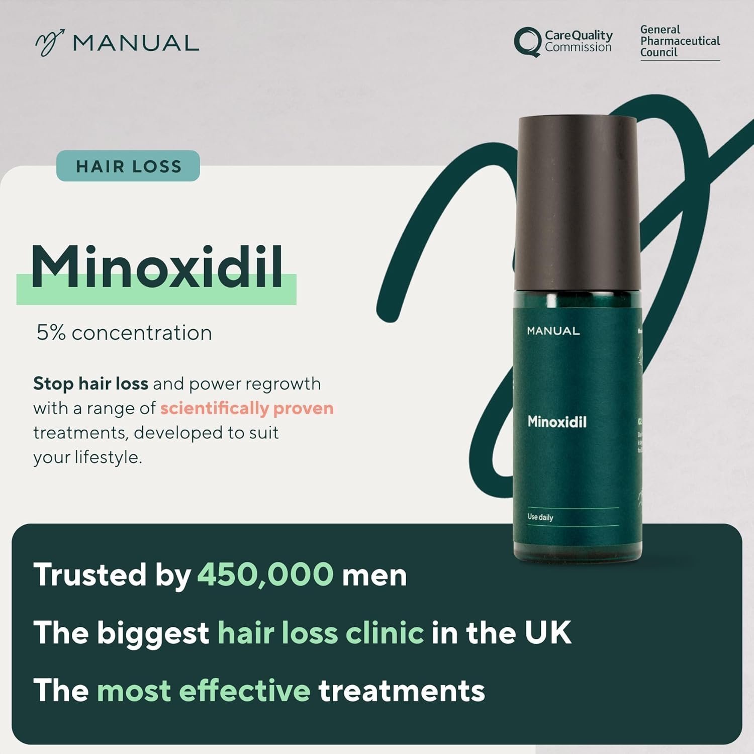 • TARGETED HAIR LOSS TREATMENT: At MANUAL, we combine science, technology and medical expertise to deliver personalised, cutting-edge hair loss treatment that put an end to hair loss. Minoxidil, one of our most popular medical treatments, and is scientifically proven to effectively treat hair loss and stimulate regrowth. With targeted treatments, expert advice and unlimited free support, there’s a reason over 200,000 people trust our hair loss plans.